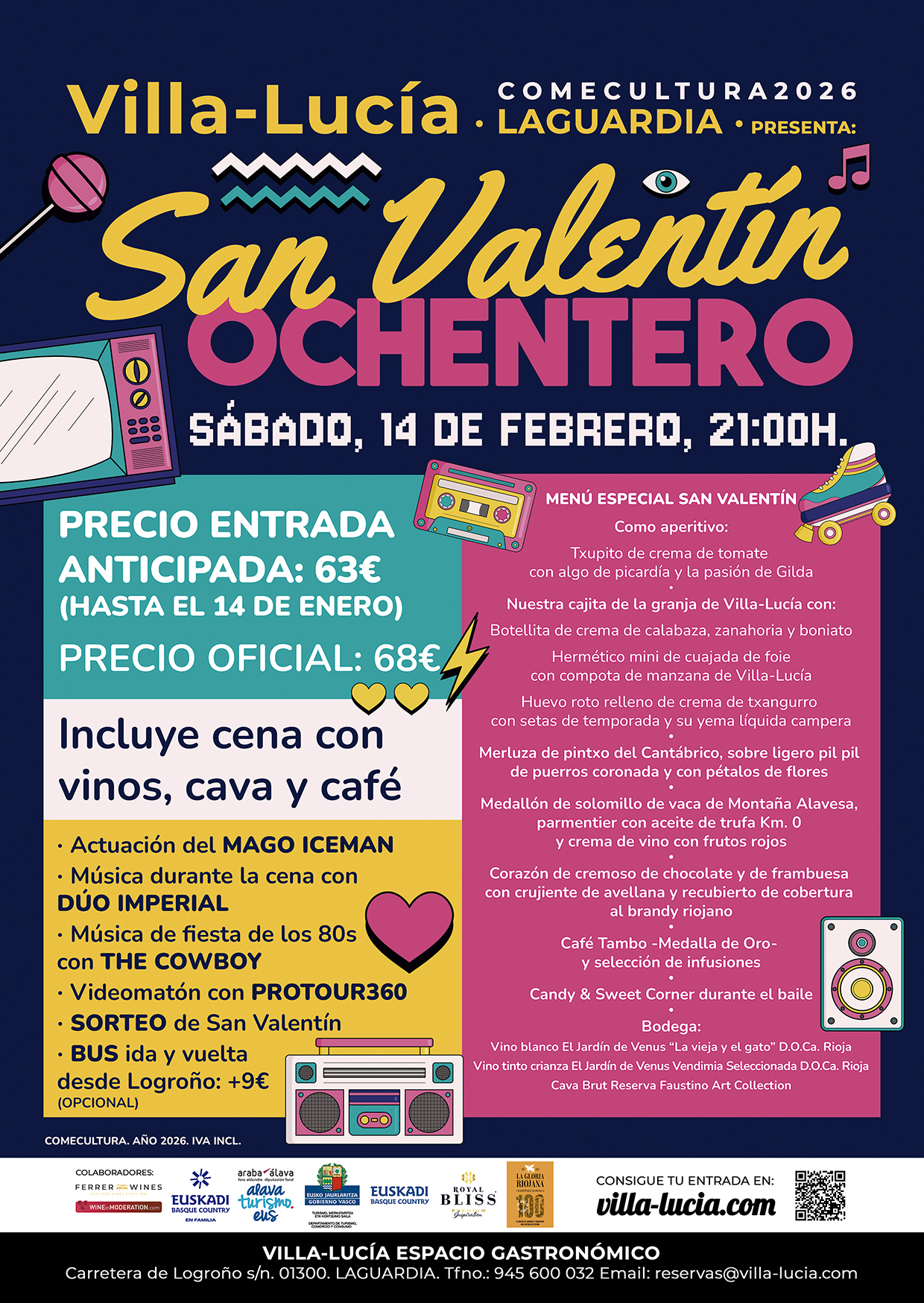 FECHA: Sábado, 14 de febrero de 2026 HORARIO: A las 21:00 horas LUGAR: Villa-Lucía Espacio Gastronómico PRECIO ENTRADA ANTICIPADA (HASTA EL 14 DE ENERO): 63€ (Iva Incl.) PRECIO ENTRADA OFICIAL: 68€ (Iva Incl.)